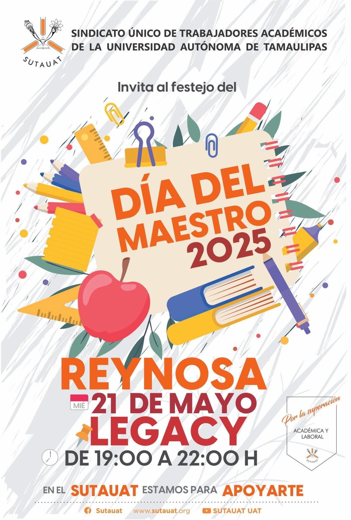 El Sindicato Único de Trabajadores Académicos de la Universidad Autónoma de Tamaulipas, hace la más cordial invitación para todos los docentes sindicalizados de Reynosa pertenecientes a esta casa de estudios, a que nos acompañen en el festejo del Día del Maestro.