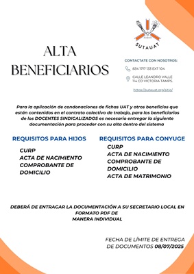 Diplomado en Tanatología y sentido de vida Dr. José Guadalupe Rivera Perez 25 noviembre, 2025 Iniciativa que transforma vidas Dr. José Guadalupe Rivera Perez 21 noviembre, 2025 Festejo Navideño 2025 zona centro Dr. José Guadalupe Rivera Perez 12 noviembre, 2025 Compartimos información de interés, los teléfonos de contacto los pueden encontrar al final de la imagen. Dr. José Guadalupe Rivera Perez 21 agosto, 2025 Beneficios Dr. José Guadalupe Rivera Perez 11 julio, 2025 Entrega de automóviles 2025 Dr. José Guadalupe Rivera Perez 4 julio, 2025 Alta de beneficiarios Dr. José Guadalupe Rivera Perez 24 junio, 2025 Registro de tallas para uniformes del personal sindicalizado Dr. José Guadalupe Rivera Perez 24 junio, 2025 Promocion especial en sus vehículos Dr. José Guadalupe Rivera Perez 19 junio, 2025 ¡Feliz día del Padre! Dr. José Guadalupe Rivera Perez 15 junio, 2025 21 ANIVERSARIO S.U.T.A.U.A.T Dr. José Guadalupe Rivera Perez 4 junio, 2025 Premio Universitario Dr. José Guadalupe Rivera Perez 19 mayo, 2025 Festejo día del Maestro, Reynosa Dr. José Guadalupe Rivera Perez 17 mayo, 2025 Festejo día del Maestro, Nuevo Laredo Dr. José Guadalupe Rivera Perez 15 mayo, 2025 Maestro, Muchas Felicidades Dr. José Guadalupe Rivera Perez 14 mayo, 2025 Muchas Felicidades, Mamá Dr. José Guadalupe Rivera Perez 9 mayo, 2025 Compartimos la Circular No. RH/008/2025 Dr. José Guadalupe Rivera Perez 29 abril, 2025 Tercera Campaña de divulgación de la ciencia y la investigación Dr. José Guadalupe Rivera Perez 28 febrero, 2025 Votaciones 2024 Dr. José Guadalupe Rivera Perez 15 octubre, 2024 Divulgando la Ciencia y la Investigación Dr. José Guadalupe Rivera Perez 9 octubre, 2024